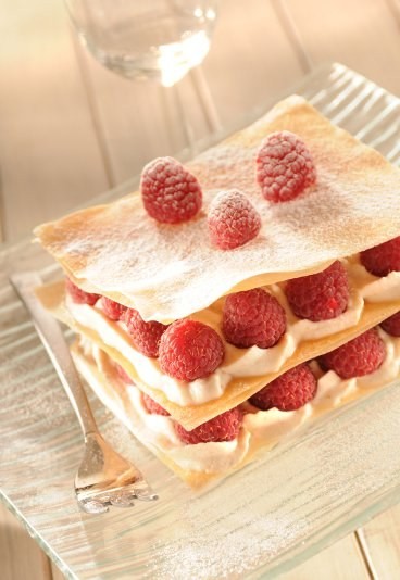 Sur une assiette à dessert, montez le feuilleté et disposant en alternance feuilles de brick, yaourt battu et framboises.